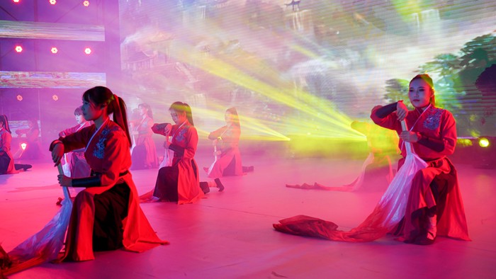 鼓点铿锵有力,舞姿翩跹优美。开场舞《九州同》以大气磅礴的演绎拉开晚会序幕。舞者们用柔美的舞姿勾勒山河壮阔,用灵动的舞步传递家国情怀,瞬间点燃现场氛围。